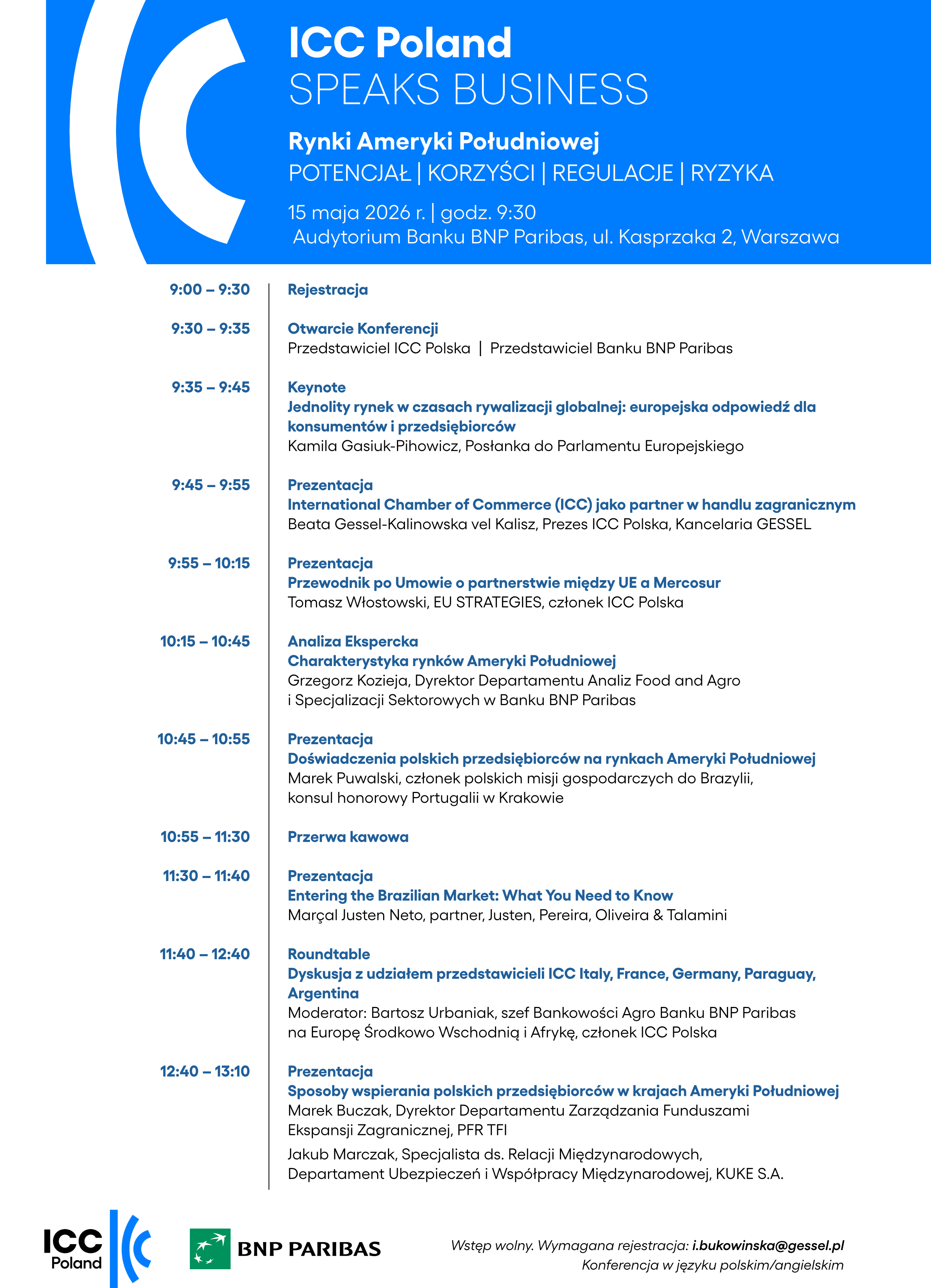 W programie wydarzenia przewidziano wystąpienia ekspertów, przedstawicieli Komitetów Narodowych ICC oraz praktyków biznesu, którzy przedstawią zagadnienia związane m.in. ze współpracą handlową, umową UE-Mercosur, specyfiką rynków oraz wyzwaniami, z jakimi mierzą się firmy działające w regionie.