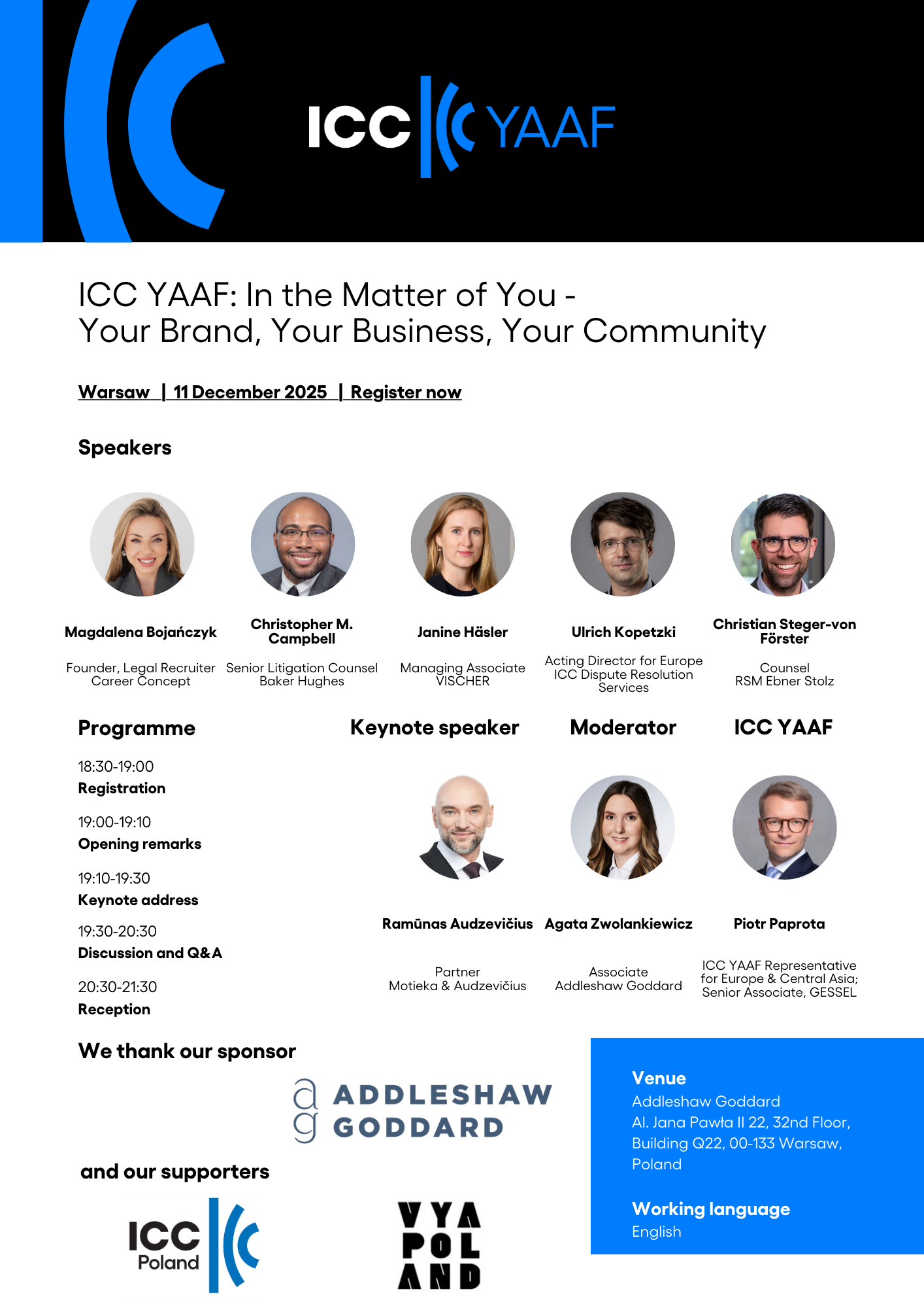 WydarzenieICCYAAF cordially invites you to join a lively ICC YAAF session, with YOU in the spotlight, followed by a reception, hosted by Addleshaw Goddard Poland in Warsaw, on 11 December 2025, at 18:30-21:30 (CET), and held at the occasion of the annual ICC Poland Charity Christmas Dinner.